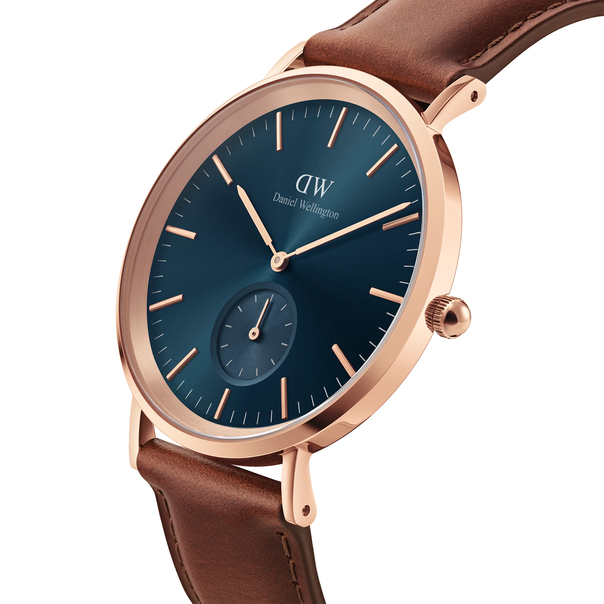 This update to our Classic watch goes one step further with a blue multi-eye dial for you to track down the seconds. Features an interchangeable brown leather strap and rose gold details.
