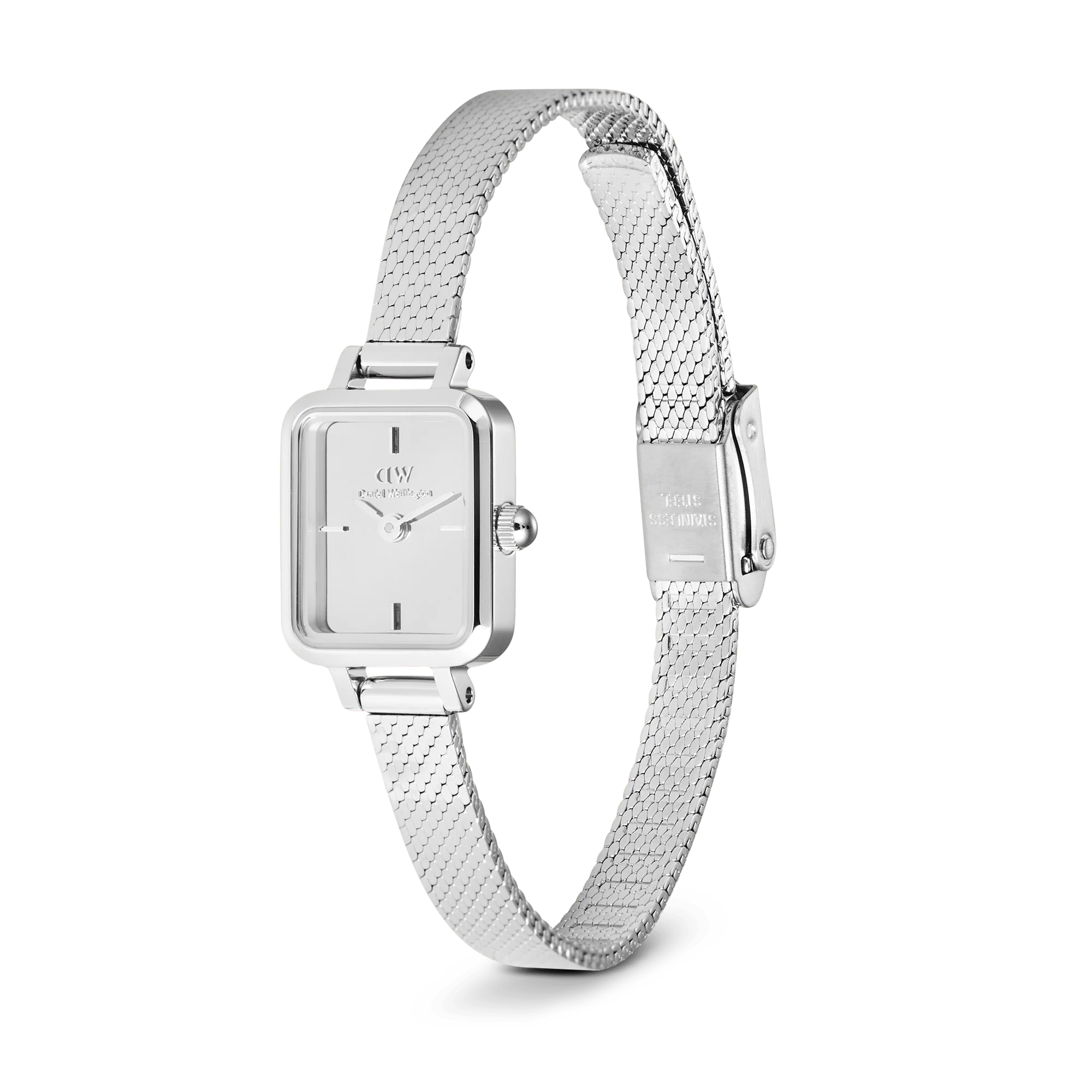 This updated Quadro Mini features a genuine mirror glass dial that perfectly complements the fully polished components of the watch. The new mesh strap, with its flattened and polished design, creates a seamless mirror effect throughout the entire piece. The result is an exclusive yet playful expression, blending sophisticated elegance with a touch of modern flair.